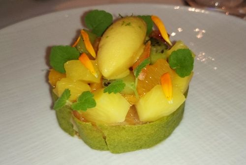 Tartelette aux fruits (mangue, kiwi, ananas victoria, combawa) et sorbet banane/passion. Une belle fraîcheur pour finir tout en légèreté. C'est parfumé, acidulé... bref parfait pour terminer ce magnifique déjeuner !