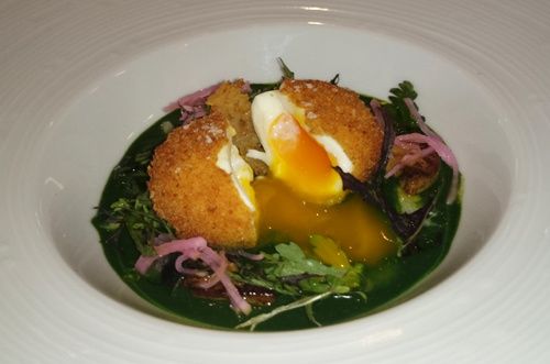 Oeuf frit sur un velouté d'herbes et feuilles de géranium accompagné de quelques morceaux de foie gras frais. Un oeuf à la cuisson parfaite avec un jaune coulant qui apporte un crémeux qui se marie à merveille avec les notes vertes du géranium, et celles légèrement piquantes du cresson des près et des quelques feuilles de mizuna (légume japonisant qui ressemble à la roquette).