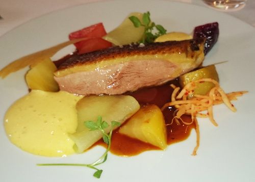 Canette de la Dombes rôtie, betteraves glacées et condiment moutarde, jus de merguez. La canette est une merveille ! Idem pour les légumes glacés ou travaillés façon kimchi (marinés dans de la saumure). L'équilibre des saveurs et des textures est là aussi parfait avec le côté goûtu de la canette, l'aigre-doux des légumes, la puissance contrôlée du jus de merguez sans oublier le subtil piquant et l'acidulé de l'émulsion de moutarde.