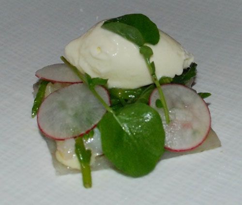 Carpaccio de bar, haddock et coques, radis, salicornes pommes de terre et sorbet au raifort. De multiples textures, de la fraîcheur et du goût !