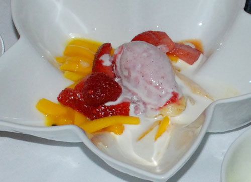 Lait de coco au citron vert, fraises, mangue et sorbet à la framboise. SImple mais terriblement efficace en terme de gourmandise, de légèreté et de fraîcheur.