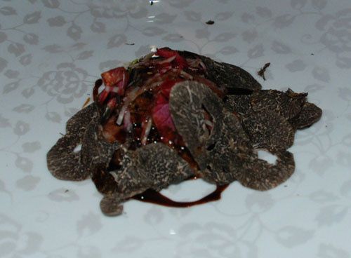Filet de boeuf Wagyu au poivre, confit de chou rouge, haricots blancs, lentilles et champignons Shiitake. Parsemé de truffe noire (Mélanosporum). Une viande tendre et goûteuse qui associe ses saveurs à la puissance de la truffe et à l'aigre doux du chou.