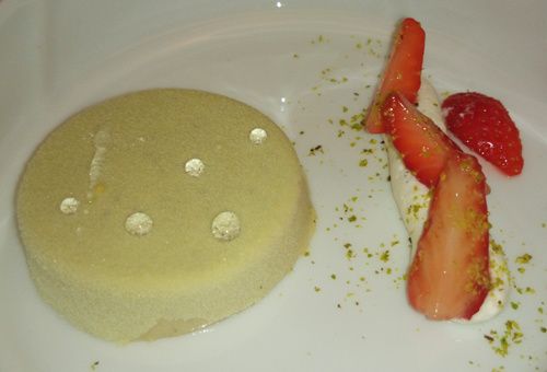 Palet pistache, chantilly à la vanille et fraises. La crème pistache délivre des notes grillées bien présentes. La fraise et la chantilly apportent rondeur et fraîcheur pour un dessert classique dans l'association des saveurs mais parfaitement maîtrisé.