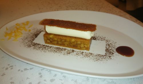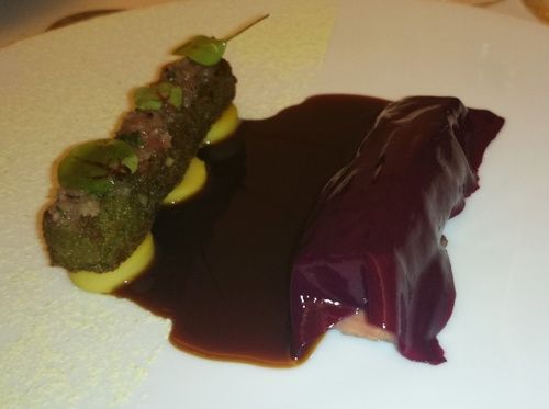 Canette caramélisée, croustillant au cassis et pois cassés. La canette est sublime. Elle impose son savoureux goût de gibier qui s'allie à merveille avec l'acidulé de la gelée de cassis, même si je dois avouer que je m'attendais à un goût de cassis plus marqué ! Le jus corsé fait le lien avec le pois cassés traité en 3 façons : une poudre plutôt amère qui tapisse une moitié d'assiette, une purée onctueuse et un pavé façon falafel avec le pois cassé travaillé avec du vinaigre vierge et le jus de cuisson. Un version modernisée d'un plat rustique qui fait mouche !