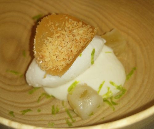 Coco, citron vert et loukoum au citron. Mousse et crème glacée coco avec une gelée de citron, des zests de citron vert et un petit loukoum avec une texture molle et granuleuse si particulière. Une belle fraîcheur !