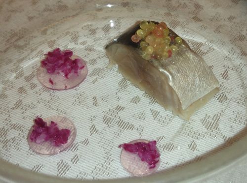 Maquereau, radis et citron caviar : un poisson cru, bien goûtu, qui s'éveille avec l'explosion en bouche des petites billes de citron caviar, et leur acidulé, sans oublier les notes terreuses du radis.