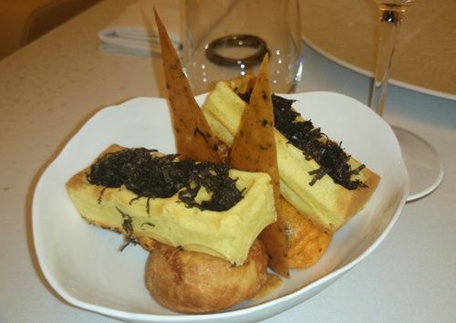 Une mise en bouche avec une gaufre à la truffe noire, de petites gougères au parmesan et à la tomate, et une tuile à l'algue nori.