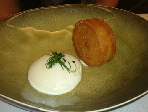 Pomme de terre croustillante, brandade de cabillaud et herbes potagères. La pomme de terre prend une forme originale, à la manière d'un kouign amann. Elle est super fondante et savoureuse (même si un peu grasse) alors que la brandade est plutôt douce en goût, contrairement à ce que l'on peut attendre d'une brandade !