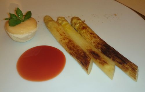 Asperges blanches et oranges maltaises. L'orange maltaise (semi-sanguine) se décline en deux façons : une crème onctueuse au goût de lemon curd et une petite sauce acidulée, qui fonctionnent bien avec la petite amertume des asperges bien fermes.