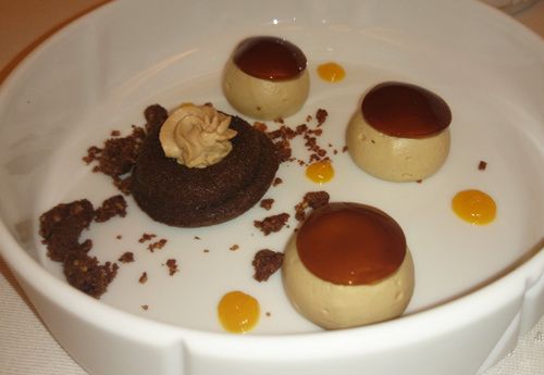 Fondant chocolat, biscuit chocolat, chantilly et gelée au café, confit d'orange. Des saveurs puissantes et un jeu de textures complet avec l'amertume du café (en chantilly, en crème et en gelée), la douceur du chocolat (en fondant et en biscuit) et l'acide et le fruité du confit d'orange qui apporte aussi de la fraîcheur.