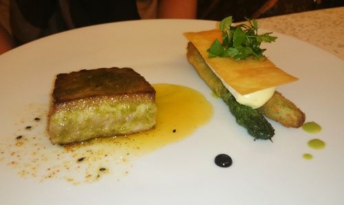Pièce de thon grillée "shichimi" et asperges. Un thon cuit à la perfection et préparé avec une huile du Japon et du shichimi, un mélange de 7 épices japonais. Les asperges panées sont bien fermes. Elles sont accompagnées par une crème et une tuile au parmesan.
