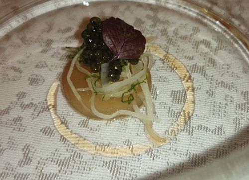 Radis Daikon confit, caviar et shiso. Iodé, sucré avec de petites notes qui rappellent les épices indiennes !