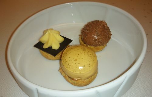 Une série de 3 choux avec comme base un demi chou accompagné de caramel au beurre salé (coulis, crème et gelée) pour l'un, d'une fine plaque de chocolat noir surmontée d'une crème au citron pour l'autre et pour le dernier, d'une mousse au chocolat qui renferme un coulis de framboise.