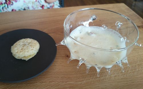 Tuiles de parmesan, pistache et grenade (sur la gauche). Croustillant avec un parmesan très présent qui laisse peu à peu la place au crémeux de la pistache. Par contre difficile de retrouver la grenade !
