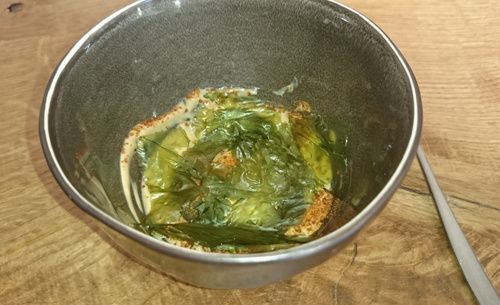 Glace wasabi, huile de homard, graines de sésame. Servie en accompagnement de la bonite, la glace wasabi permet de juguler la force des saveurs en apportant fraîcheur et rondeur.