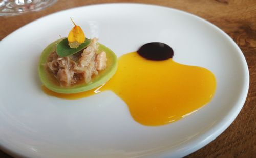 Tourteau, concombre sicilien, lait de poule et sang de betterave. Le végétal et l'iode se rencontrent avec l'onctuosité du lait de poule qui donne de la rondeur à cette magnifique bouchée.