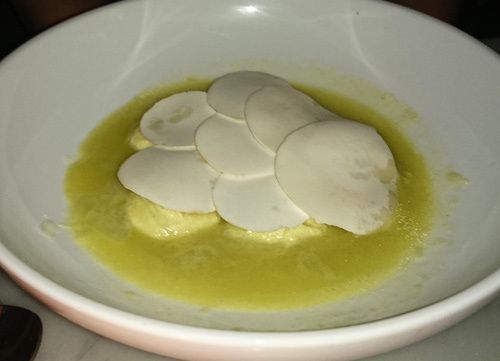 Burrata/salsa verde/pain carbonisé (17$). Un petit tour en Italie avec cette entrée fraîche et gourmande. Onctueuse et crémeuse, la burrata s'associe à merveille à la salsa verde (sauce typique du Piémont), qui apporte goût et peps, et aux notes brûlées du pain.