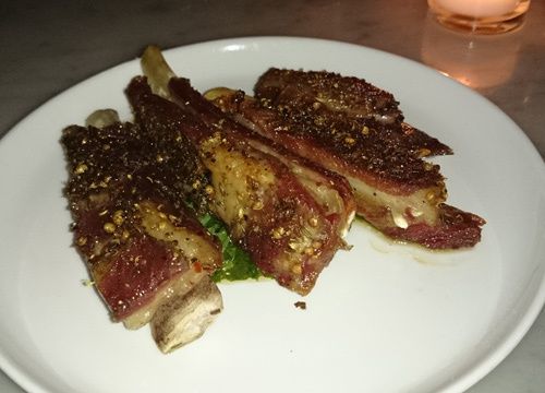 Côtes d'agneau au miel et charmoula (21$). Un détour par le Maghreb avec des côtes d'agneau (on parlera plus de ribs aux Etats-unis) marinées au miel et à la charmoula, un mélange d'épices assez relevé (en général : persil, ail, poivre noir, piment séché, paprika et huile d'olive). Un sucré/salé/épicé qui fonctionne très bien avec l'agneau goûtu, à la fois confit et caramélisé.
