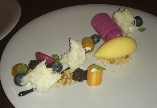 Angel food cake, meringue à la myrtille, mûres et crème glacée au melon italien Cantaloup (13$). Un dessert frais et léger sous influence américaine avec une version légère et aérienne du célèbre sponge cake US auquel s'adjoint une association de fruits noirs (acidité et parfum) et de melon (douceur). Le jeu de textures est intéressant avec du fondant, du moelleux ou encore du croustillant.
