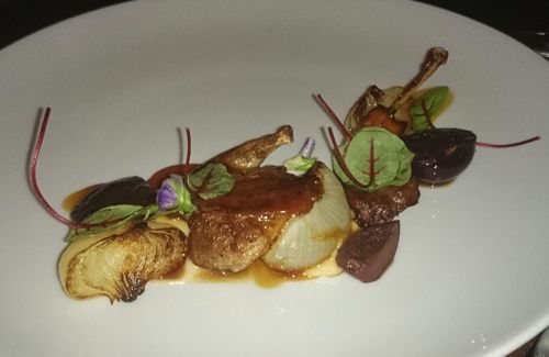 Caille/cerise/sauce pain/oignons rôtis (16$). Proposé en entrée, ce plat est superbe de saveurs avec une caille rôtie dans un beurre de foie gras, servie avec des oignons rôtis, de la cerise fraîche et une sauce au pain typiquement britannique qui accompagne traditionnellement le gibier. Elle est ici proposée en mode solide avec en complément un jus de viande.