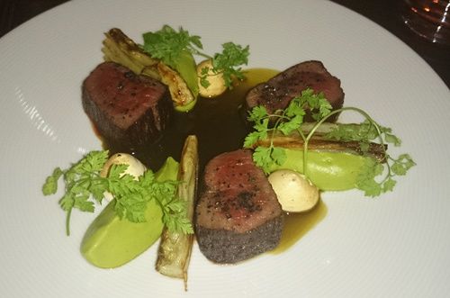 Cerf rouge de Nouvelle Zélande aux saveurs de gin (33$). L'un des plats signature de la Maison avec du cerf rouge en provenance directe de Nouvelle-Zélande (élevage Cervena) qui est travaillé ici autour d'ingrédients comme le genièvre, la coriandre, la réglisse ou le fenouil, utilisés traditionnellement dans l'élaboration du Gin, cet alcool britannique emblématique. Cuits sous vide pendant 45mn avant d'être saisis à la poêle, les morceaux sélectionnés par Matt Lambert proviennent du cuissot du cerf. Ils offrent une belle tendreté et une viande au goût moins faisandé que le cerf (élaphe) que l'on trouve notamment en Europe. La viande est accompagnée par de petites meringues de genièvre, du fenouil grillé, une purée de céleri-rave à la coriandre et un jus de viande (poulet, boeuf et cerf) à la réglisse et au vinaigre de Xérès. Un vrai plat de caractère, complexe mais équilibré !