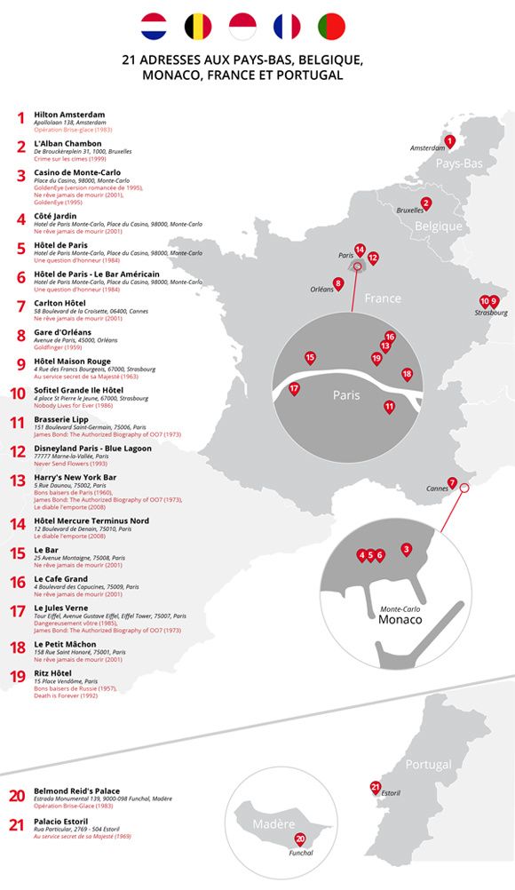 Amateur de caviar Beluga, de vins mythiques (Mouton Rothschild 1955, Cheval Blanc 1982, Angelus 1982...) et de grands Champagne (Taittinger, Bollinger ou Dom Pérignon), James Bond est sans nul doute le plus épicurien des héros modernes ! Au gré de ses aventures littéraires et cinématographiques, l'espion britannique a fréquenté les plus beaux hôtels du monde ainsi qu'une multitude de restaurants que le voyagiste en ligne GoEuro s'est attaché à compiler à travers plusieurs infographies par zone géographique. Au total, 72 restaurants ont été identifiés dans 56 romans et 23 films.