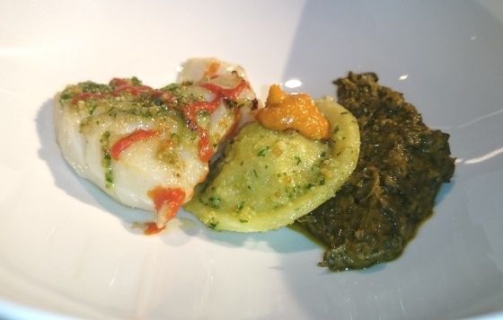Culture Bantou : cabillaud fumé et snacké, saka saka (feuilles de manioc cuites à la congolaise avec de la poudre de poisson et une crème de cacahuète), ravioli de banane plantain à la morue. Un plat marin de caractère avec un saka saka goûtu et un superbe cabillaud réhaussé par un condiment aux herbes et une sauce au piment expurgée du piquant pour ne conserver que les notes si spécifiques du piment. Une mention toute particulière au ravioli de banane plantain ferme et fondant.
