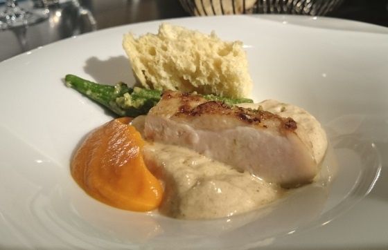Mafé - Quatre Temps : Poulet fermier fumé, espuma de mafé, brioche d'arachide, gombo confit et purée de patates douces au lait de coco. Une viande moelleuse qui s'envole dans un nuage de mafé marqué en cacahuète. La patate douce apporte une jolie rondeur accentuée par les notes de coco alors que le gombo enrobe la bouche de son gluant si particulier. Une jolie réussite !