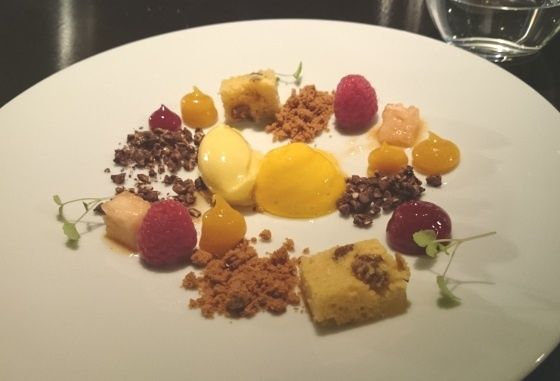 My african Dream : Ananas cakes, brioche de café, crumble de chocolat tanzanien, sorbet de Barbadine (sorte de mangue plus subtile en goût) à la citronnelle, Fruit de la Passion, Mangue. Un final sucré tout en légèreté et en fraîcheur avec un festival de textures et de saveurs.