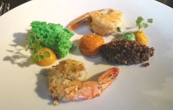 Homeland : Crevettes de l'île Maurice marinées dans un mélange d'épices malienne, caviar du Kenya à base de quinoa, mangue, brioche d'herbes vertes, gingembre, avocat et sauce zoulou. Un plat assez puissant avec le fumé très marqué du quinoa qui s'apaise sous l'effet acidulé/sucré et chargé de parfums des condiments à la mangue, à l'avocat sans oublier la sauce zoulou à base de tomate séchées et d'épices.
