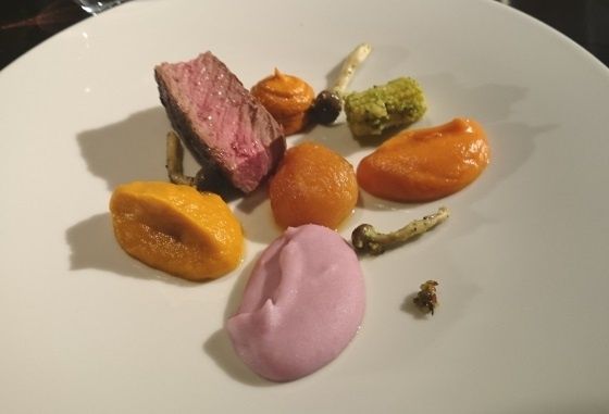 Soweto Grill : Filet d'agneau fumé et grillé, igname violet, abricot confit, carotte et sauce Soweto. Une partition aux accents sud-africains qui parait un peu lourde avec beaucoup d'éléments mais qui trouve finalement un très bel équilibre entre la douceur de l'agneau, le sucré et le fruité de l'abricot (très utilisé en Afrique du sud avec des grillades), l'igname, la purée de carotte, les petits champignons et le maïs.