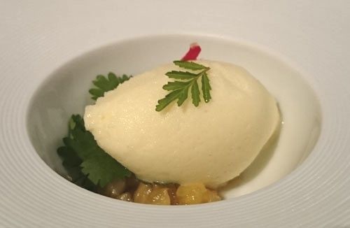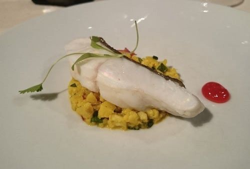 Turbot, choux fleur au curry, crème de chèvre frais et gelée de mandarine, piment et safran.