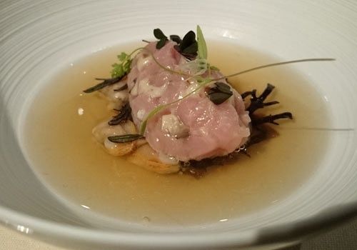 Magnifique terre-mer japonisant avec ce tartare de veau aux huitres, coques et Dashi.