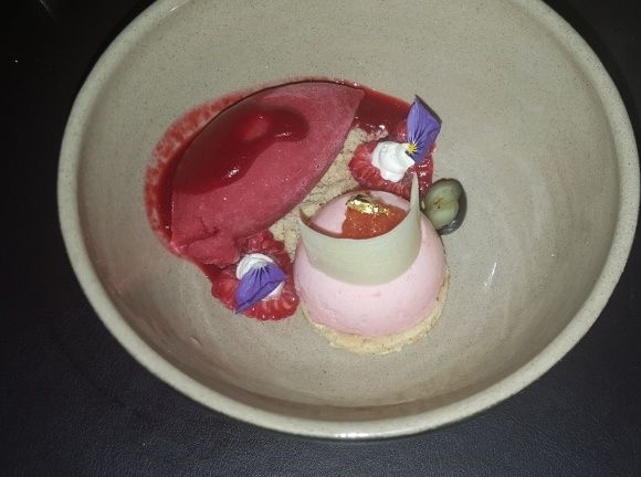 Crème mascarpone/rose, glace tomate/framboise et biscuit ghriba. Un joli pré dessert frais et vif avec une belle association tomate/framboise, la douceur du crémeux mascarpone/rose, sans oublier le crumble de ghriba, biscuit traditionnel, qui apporte de la texture.