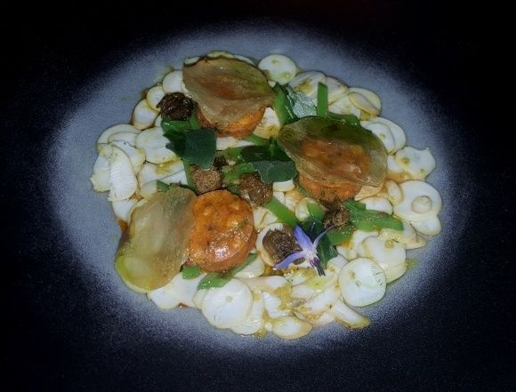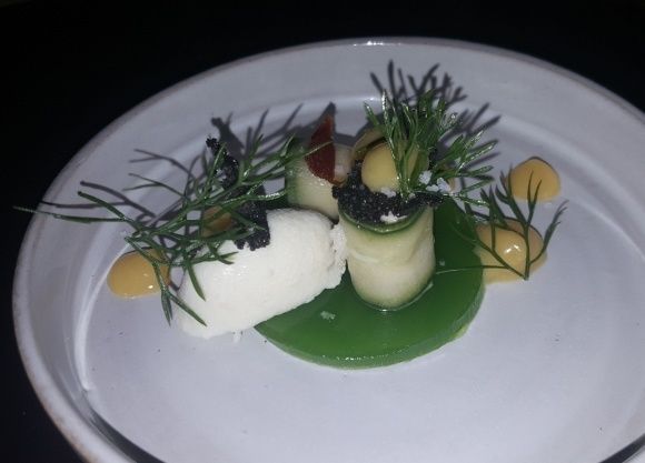 Cannelloni de concombre, araignée de mer, chantilly fenouil, gelée de concombre, orange et huile d'argan. Une superbe mise en bouche toute en fraîcheur et légèreté qui donne le ton du reste du repas avec une belle variété de saveurs et de parfums.