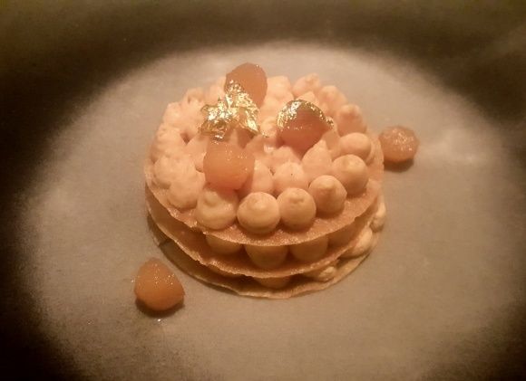 Pastilla au praliné noisettes, perles de coing aux épices douces. Une version déstructurée de la célèbre pastilla, façon millefeuille, qui pour moi manque d'éclat. Je ne suis pas convaincu par l'association praliné/coing qui manque de caractère et de peps. J'ai préféré la fraîcheur et la pétillance du pré dessert.