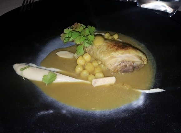 Poulet au citron confit, purée de céleri à l'huile d'argan, billes de céleri, m’quali à l’olive violette et jus corsé. Le plat le moins surprenant du dîner qui offre néanmoins une belle variété de saveurs et de parfums.